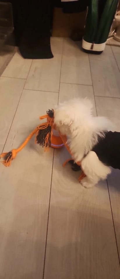 My dog loves it! I usually tie a little treat to this toy and my dog chases after it like crazy! It’s a great toy for a small to medium dog. I highly recommend it! Delivered very fast! THANK YOU SO MUCH. ❤️❤️❤️